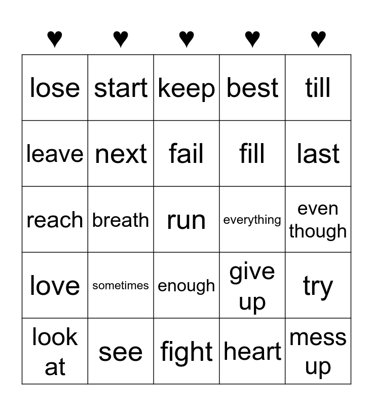 This bingo card has 25 words: sometimes, fight, fail, look at, till, lose, leave, start, everything, enough, fill, reach, give up, try, next, mess up, even though, keep, last, breath, run, see, love, best and heart.