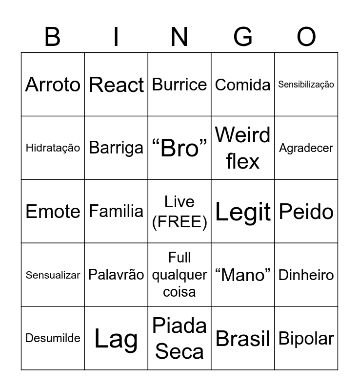 This bingo card has a free space and 34 words: Casa dos youtubers, Brasil, Analfabetismo, Momento De Filosofia, Sensualizar, Barriga, Sensibilização, Desumilde, React, Windoh, “Bro”, Burrice, Imitar Windoh, Insulto, Legit, Agradecer, Lag, Emote, Palavrão, “Mano”, Full qualquer coisa, Donation, Arroto, Peido, Piada Seca, Bipolar, Comida, Sound Effect, Weird flex, Hidratação, Ver outra live, Familia, Dinheiro and “Mano”.