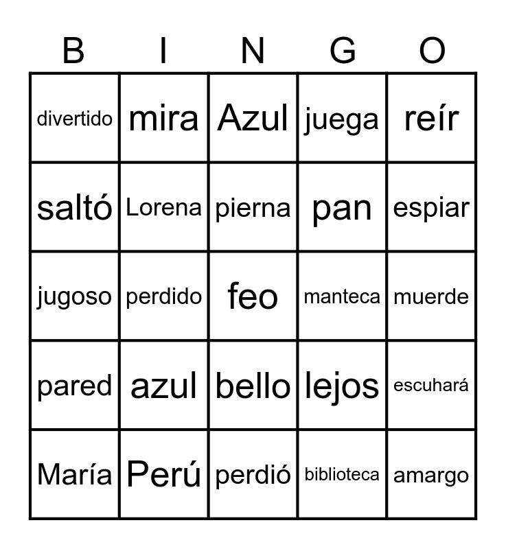 This bingo card has a free space and 24 words: azul, Perú, pierna, María, reír, divertido, saltó, mira, manteca, bello, pan, jugoso, lejos, escuhará, Lorena, biblioteca, muerde, Azul, espiar, perdido, amargo, pared, juega and perdió.