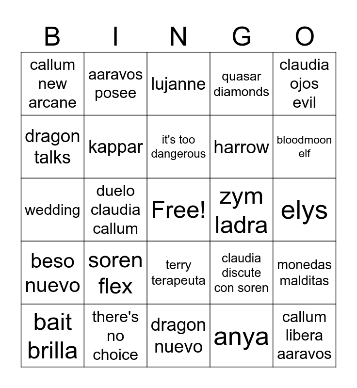 This bingo card has a free space and 24 words: soren flex, there's no choice, it's too dangerous, bait brilla, claudia ojos evil, callum new arcane, dragon talks, aaravos posee, zym ladra, terry terapeuta, harrow, wedding, claudia discute con soren, monedas malditas, kappar, anya, elys, lujanne, bloodmoon elf, duelo claudia callum, callum libera aaravos, beso nuevo, quasar diamonds and dragon nuevo.