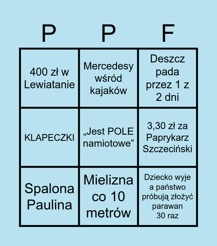 This bingo card has a free space and 8 words: KLAPECZKI, Mercedesy wśród kajaków, 3,30 zł za Paprykarz Szczeciński, Spalona Paulina, Deszcz pada przez 1 z 2 dni, 400 zł w Lewiatanie, Mielizna co 10 metrów and Dziecko wyje a państwo próbują złożyć parawan 30 raz.