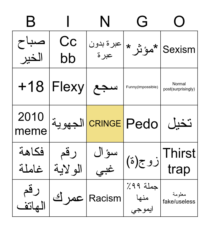 This bingo card has a free space and 24 words: رقم الهاتف, رقم الولاية, سجع, جملة ٩٩٪ منها ايموجي, Sexism, صباح الخير, Cc bb, عبرة بدون عبرة, Pedo, تخيل, 2010 meme, Flexy, زوج(ة), Thirst trap, +18, عمرك, Racism, *مؤثر*, Normal post(surprisingly), فكاهة غاملة, الجهوية, سؤال غبي, Funny(impossible) and معلومة fake/useless.
