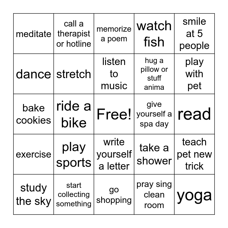 This bingo card has a free space and 24 words: play sports, start collecting something, listen to music, study the sky, smile at 5 people, meditate, dance, call a therapist or hotline, give yourself a spa day, write yourself a letter, hug a pillow or stuff anima, bake cookies, take a shower, teach pet new trick, stretch, pray sing clean room, read, memorize a poem, play with pet, ride a bike, yoga, exercise, watch fish and go shopping.