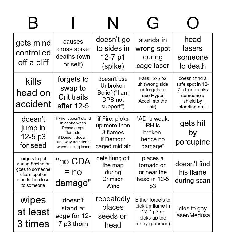 This bingo card has 25 words: "no CDA = no damage", repeatedly places seeds on head, doesn't use Unbroken Belief ("I am DPS not support"), wipes at least 3 times, head lasers someone to death, gets mind controlled off a cliff, kills head on accident, causes cross spike deaths (own or self), "AD is weak, RH is broken, hence no damage", gets flung off the map during Crimson Wind, Fails 12-5 p2 ult (wrong side or forgets to use Hyper Accel into the air), doesn't jump in 12-5 p3 for seed, places a tornado on or near the head in 12-5 p3, doesn't find his flame during scan, forgets to swap to Crit traits after 12-5, dies to gay laser/Medusa, gets hit by porcupine, doesn't go to sides in 12-7 p1 (spike), doesn't find a safe spot in 12-7 p1 or breaks someone's shield by standing on it, if Fire: doesn't stand in centre when Rosso drops Tornado if Demon: doesn't run away from team when placing laser, if Fire: picks up more than 3 flames if Demon: caged mid air, doesn't stand at edge for 12-7 p3 thorn, forgets to put during Scythe or goes to someone else's spot or stands too close to someone, stands in wrong spot during cage laser and Either forgets to pick up flame in 12-7 p3 or picks up too many (pacman).