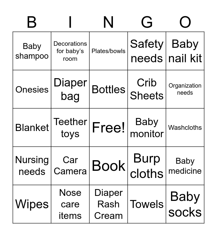 This bingo card has a free space and 29 words: Wipes, Baby Utensils, Teether toys, Diapers, Baby shampoo, Plates/bowls, Diaper bag, Car Camera, Baby monitor, Nose care items, Washcloths, Baby socks, Diaper Rash Cream, Towels, Organization needs, Baby carrier, Book, Nursing needs, Baby nail kit, Blanket, Burp cloths, Baby outfit (shorts & shirt), Crib Sheets, Onesies, Safety needs, Decorations for baby’s room, Baby medicine, Bottles and Lotion.