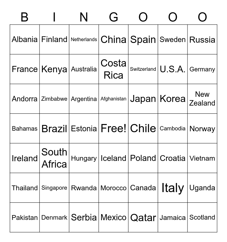 This bingo card has a free space and 48 words: Canada, U.S.A., Mexico, Brazil, Argentina, Norway, Finland, Denmark, Sweden, Iceland, Russia, China, Korea, Japan, Thailand, Cambodia, France, Germany, Italy, Spain, Switzerland, Estonia, Albania, Kenya, Uganda, Australia, New Zealand, Pakistan, Afghanistan, Zimbabwe, Jamaica, Chile, Vietnam, Singapore, Bahamas, Poland, Croatia, Andorra, Hungary, Rwanda, Ireland, Scotland, Netherlands, Serbia, Costa Rica, Morocco, South Africa and Qatar.