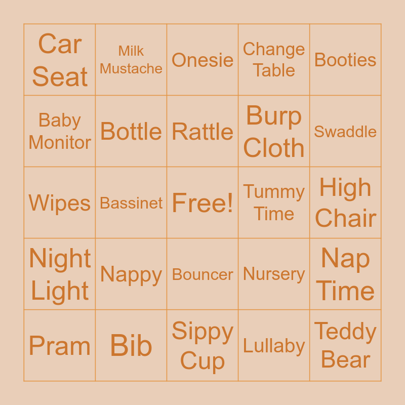 This bingo card has a free space and 29 words: Pram, Cot, Bassinet, Dummy, Car Seat, Onesie, Bottle, Nappy, Tummy Time, Bib, High Chair, Teddy Bear, Sippy Cup, Lullaby, Swaddle, Mittens, Bouncer, Night Light, Booties, Wipes, Nursery, Breast Pump, Burp Cloth, Baby Monitor, Change Table, Milk Mustache, Nap Time, Rattle and Teething.