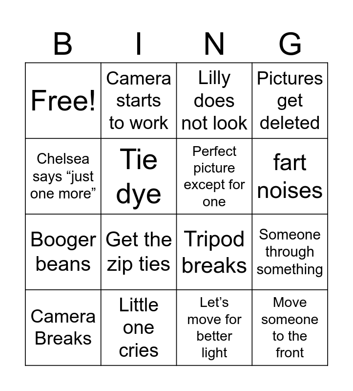 This bingo card has 16 words: Camera Breaks, Little one cries, Lilly does not look, Pictures get deleted, Chelsea says “just one more”, Camera starts to work, Tripod breaks, Someone through something, Free!, Tie dye, Let’s move for better light, fart noises, Booger beans, Get the zip ties, Perfect picture except for one and Move someone to the front.