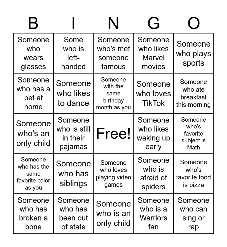 This bingo card has a free space and 24 words: Someone who has siblings, Someone who has been out of state, Someone with the same birthday month as you, Someone who has broken a bone, Someone who plays sports, Someone who wears glasses, Someone who has a pet at home, Some who is left-handed, Someone who likes waking up early, Someone who loves playing video games, Someone who loves TikTok, Someone who's an only child, Someone who is afraid of spiders, Someone who's favorite food is pizza, Someone who likes to dance, Someone who is a Warriors fan, Someone who's favorite subject is Math, Someone who's met someone famous, Someone who ate breakfast this morning, Someone who is still in their pajamas, Someone who can sing or rap, Someone who has the same favorite color as you, Someone who likes Marvel movies and Someone who is an only child.