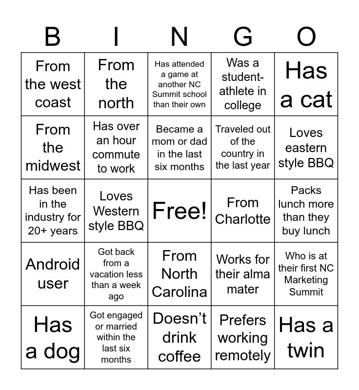This bingo card has a free space and 24 words: Got back from a vacation less than a week ago, Got engaged or married within the last six months, Became a mom or dad in the last six months, Has a dog, Has a cat, From the west coast, From the midwest, From the north, From Charlotte, From North Carolina, Traveled out of the country in the last year, Has been in the industry for 20+ years, Works for their alma mater, Who is at their first NC Marketing Summit, Has over an hour commute to work, Prefers working remotely, Packs lunch more than they buy lunch, Has attended a game at another NC Summit school than their own, Loves eastern style BBQ, Loves Western style BBQ, Has a twin, Android user, Was a student-athlete in college and Doesn’t drink coffee.