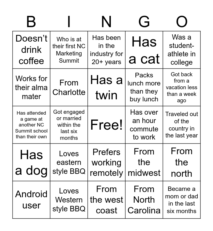 This bingo card has a free space and 24 words: Loves eastern style BBQ, Loves Western style BBQ, Has a twin, Android user, Was a student-athlete in college, Doesn’t drink coffee, Works for their alma mater, Who is at their first NC Marketing Summit, Has over an hour commute to work, Prefers working remotely, Packs lunch more than they buy lunch, Has attended a game at another NC Summit school than their own, From the midwest, From the north, From Charlotte, From North Carolina, Traveled out of the country in the last year, Has been in the industry for 20+ years, Got back from a vacation less than a week ago, Got engaged or married within the last six months, Became a mom or dad in the last six months, Has a dog, Has a cat and From the west coast.