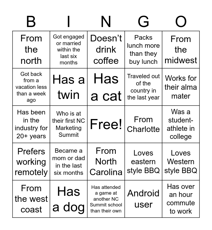 This bingo card has a free space and 24 words: Became a mom or dad in the last six months, Has a dog, Has a cat, From the west coast, From the midwest, From the north, Got back from a vacation less than a week ago, Got engaged or married within the last six months, From Charlotte, From North Carolina, Traveled out of the country in the last year, Has been in the industry for 20+ years, Loves eastern style BBQ, Loves Western style BBQ, Has a twin, Android user, Was a student-athlete in college, Doesn’t drink coffee, Works for their alma mater, Who is at their first NC Marketing Summit, Has over an hour commute to work, Prefers working remotely, Packs lunch more than they buy lunch and Has attended a game at another NC Summit school than their own.