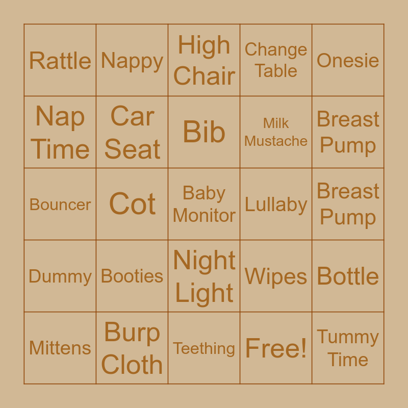 This bingo card has 32 words: Free!, Pram, Cot, Bassinet, Dummy, Car Seat, Onesie, Bottle, Nappy, Tummy Time, Bib, High Chair, Teddy Bear, Sippy Cup, Lullaby, Swaddle, Mittens, Bouncer, Night Light, Booties, Wipes, Nursery, Breast Pump, Burp Cloth, Baby Monitor, Change Table, Milk Mustache, Nap Time, Rattle, Teething, Drool and Breast Pump.