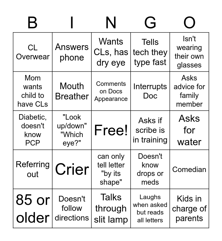 This bingo card has a free space and 24 words: Crier, Doesn't follow directions, Comments on Docs Appearance, 85 or older, Isn't wearing their own glasses, CL Overwear, Mom wants child to have CLs, Answers phone, Asks if scribe is in training, can only tell letter "by its shape", Interrupts Doc, Diabetic, doesn't know PCP, Doesn't know drops or meds, Comedian, Mouth Breather, Laughs when asked but reads all letters, Asks for water, Wants CLs, has dry eye, Asks advice for family member, "Look up/down" "Which eye?", Kids in charge of parents, Referring out, Tells tech they type fast and Talks through slit lamp.