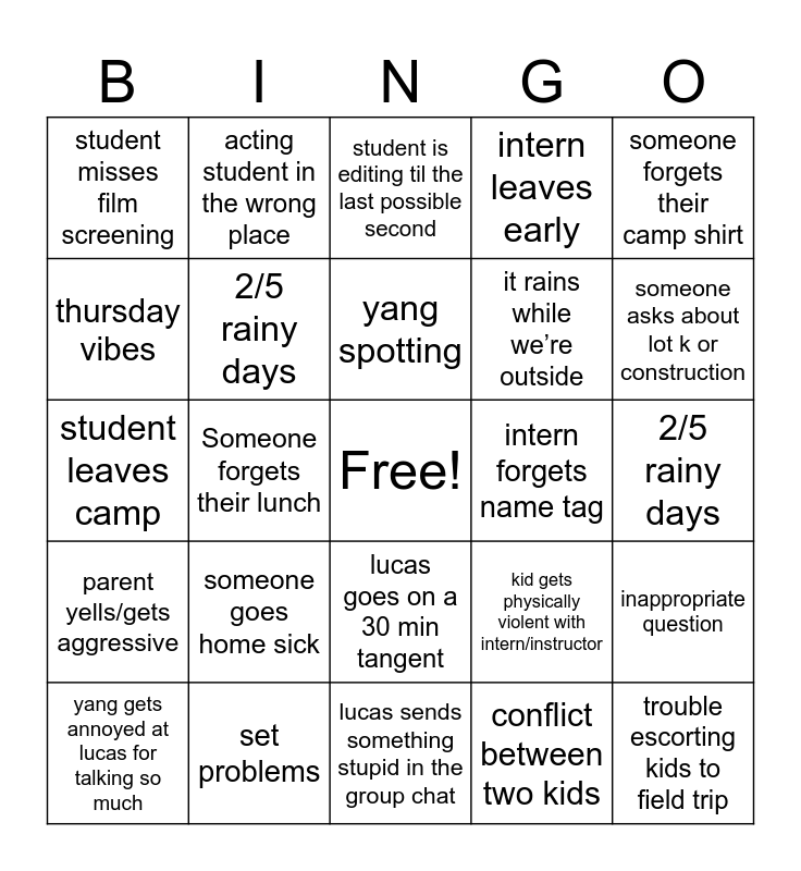 This bingo card has a free space and 24 words: someone goes home sick, set problems, yang spotting, yang gets annoyed at lucas for talking so much, someone forgets their camp shirt, student misses film screening, thursday vibes, acting student in the wrong place, intern forgets name tag, lucas goes on a 30 min tangent, it rains while we’re outside, student leaves camp, kid gets physically violent with intern/instructor, inappropriate question, 2/5 rainy days, conflict between two kids, 2/5 rainy days, student is editing til the last possible second, someone asks about lot k or construction, Someone forgets their lunch, trouble escorting kids to field trip, parent yells/gets aggressive, intern leaves early and lucas sends something stupid in the group chat.
