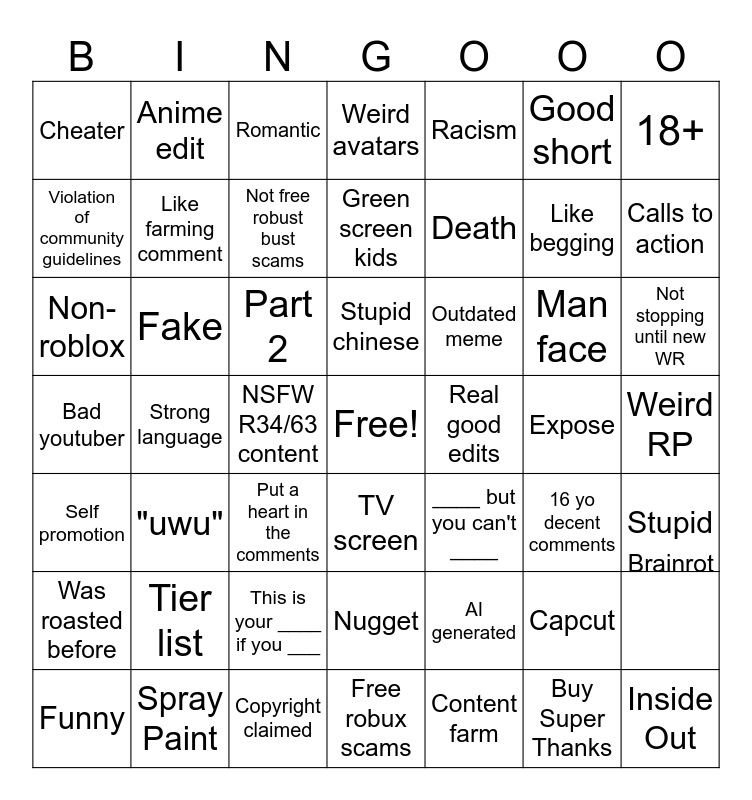 This bingo card has a free space and 48 words: AI generated, Like begging, Free robux scams, Strong language, Part 2, Weird RP, Anime edit, Spray Paint, Good short, TV screen, 18+, Weird avatars, Man face, Outdated meme, Was roasted before, Expose, Violation of community guidelines, Calls to action, Capcut, Racism, Death, NSFW R34/63 content, Cheater, Like farming comment, Brainrot, Not free robust bust scams, Not stopping until new WR, Funny, Stupid chinese, Fake, Buy Super Thanks, Real good edits, Stupid, Tier list, Bad youtuber, ____ but you can't ____, 16 yo decent comments, Non-roblox, Put a heart in the comments, This is your ____ if you ___, Self promotion, Inside Out, Romantic, Copyright claimed, Green screen kids, Nugget, "uwu" and Content farm.
