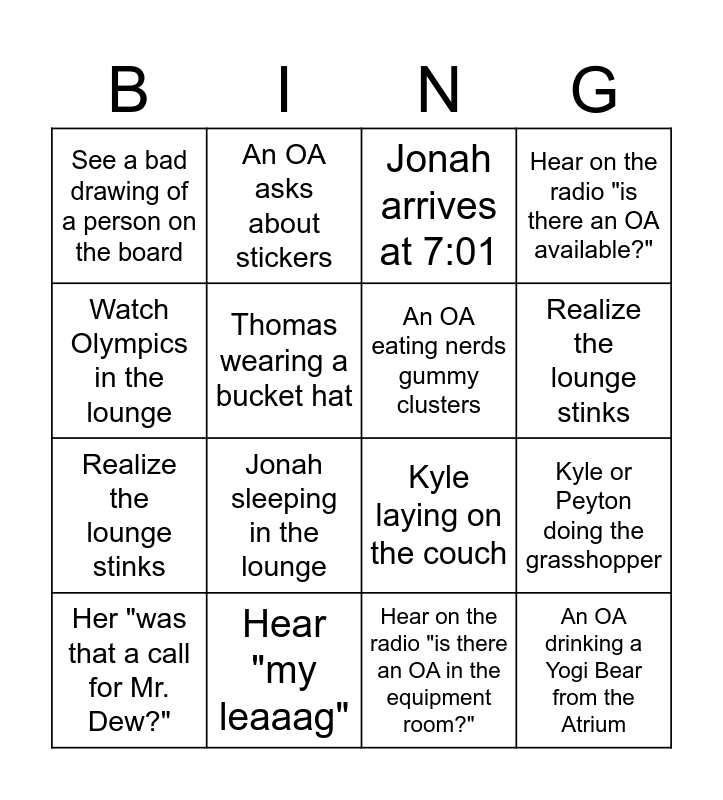 This bingo card has 20 words: Kyle or Peyton doing the grasshopper, Thomas drinking his morning redbull, Jonah arrives at 7:01, Alexa insists her dog is cute, Her "was that a call for Mr. Dew?", Watch Olympics in the lounge, Hear "my leaaag", See a bad drawing of a person on the board, Realize the lounge stinks, An OA asks about stickers, Jonah sleeping in the lounge, Kyle laying on the couch, Thomas wearing a bucket hat, An OA drinking a Yogi Bear from the Atrium, An OA eating nerds gummy clusters, Hear an OA argue with Alexa over the cuteness of her dog, Realize the lounge stinks, Hear on the radio "is there an OA available?", Hear on the radio "is there an OA in the equipment room?" and Alexa wearing heart sunglasses.