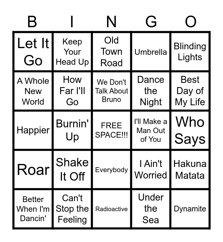 This bingo card has a free space and 29 words: Sunflower, Can't Stop the Feeling, Old Town Road, Happy, Blinding Lights, Let It Go, How Far I'Il Go, We Don't Talk About Bruno, I'll Make a Man Out of You, Hakuna Matata, Better When I'm Dancin', Burnin' Up, Under the Sea, Dynamite, Happier, What Makes You Beautiful, Radioactive, I Ain't Worried, Best Day of My Life, Roar, Shake It Off, Party in the USA, Dance the Night, Who Says, A Whole New World, Keep Your Head Up, Everybody, Umbrella and Centuries.