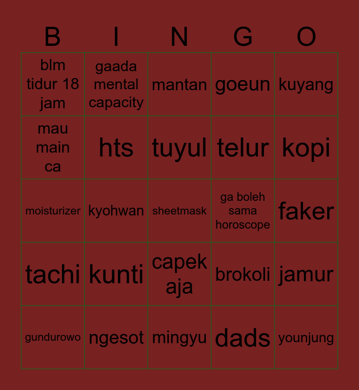 This bingo card has a free space and 24 words: kunti, ngesot, tuyul, gundurowo, kuyang, blm tidur 18 jam, mau main ca, gaada mental capacity, ga boleh sama horoscope, capek aja, telur, moisturizer, brokoli, jamur, hts, dads, faker, mantan, kopi, kyohwan, younjung, tachi, goeun and mingyu.