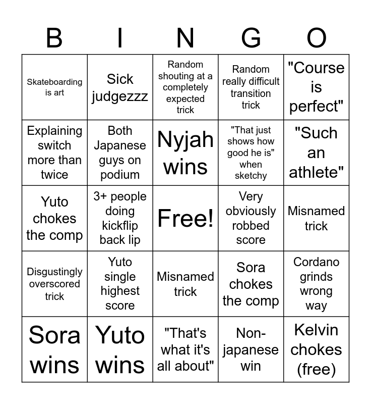 This bingo card has a free space and 24 words: Yuto single highest score, Yuto wins, Nyjah wins, Sora wins, "Course is perfect", Skateboarding is art, Explaining switch more than twice, Sick judgezzz, Very obviously robbed score, Misnamed trick, "That just shows how good he is" when sketchy, Yuto chokes the comp, Sora chokes the comp, Cordano grinds wrong way, Both Japanese guys on podium, Non-japanese win, Misnamed trick, Random shouting at a completely expected trick, "Such an athlete", 3+ people doing kickflip back lip, Kelvin chokes (free), Disgustingly overscored trick, Random really difficult transition trick and "That's what it's all about".