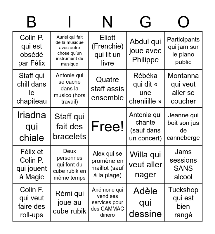 This bingo card has a free space and 37 words: Rémi qui dit «smate», Félix qui dit chuuut!, Victorya qui se sauve des bébittes, Antonie qui se cache dans la musico (hors travail), Jams sessions SANS alcool, Deux personnes qui font du cube rubik en même temps, Quatre staff assis ensemble, Alden qui joue Autumn Leaves, Participants qui jam sur le piano public, Humains qui jouent la contrebasse à Abdul (sauf Abdul), Staff qui fait des bracelets, Abdul qui joue avec Philippe, Tuckshop qui est bien rangé, Jeanne qui boit son jus de canneberge, Staff qui chill dans le chapiteau, Félix et Colin P. qui jouent à Magic, Alden qui dit «non mais c’est chill pour un mortel », Eliott (Frenchie) qui lit un livre, Alex qui se promène en maillot (sauf à la plage), Antonie qui chante (sauf dans un concert), Colin P. qui est obsédé par Félix, Montanna qui veut aller se coucher, Colin F. qui veut faire des roll-ups, Anémone qui vend ses services pour des CAMMAC dinero, Hannah qui donne des câlins, Adèle qui dessine, Auriel qui fait de la musique avec autre chose qu’un instrument de musique, Hugo qui siffle, Victorya qui meurt de rire, Elliot (Cousin) sur son téléphone au solarium, Sandrine qui danse dans le couloir, Rémi qui joue au cube rubik, Iriadna qui chiale, Hailie qui parle du complot des écureils, Willa qui veut aller nager, Rébéka qui dit « une cheniiille » and Pierre qui est sarcastique.