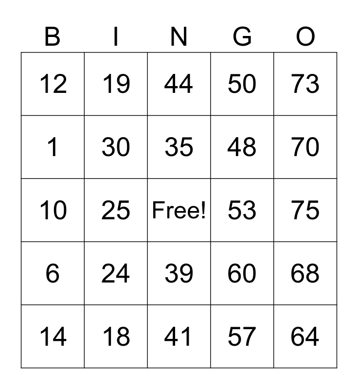 This bingo card has a free space and 24 words: 14, 24, 35, 57, 73, 12, 19, 44, 53, 75, 10, 30, 60, 68, 1, 18, 41, 50, 70, 6, 25, 39, 48 and 64.