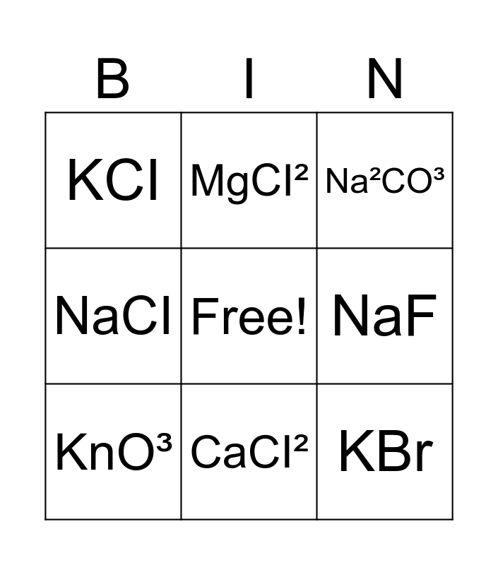 This bingo card has a free space and 8 words: NaCI, MgCI², NaF, KnO³, Na²CO³, KCI, CaCI² and KBr.