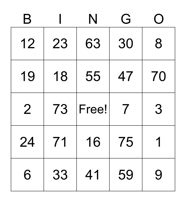 This bingo card has a free space and 24 words: 71, 33, 55, 6, 8, 12, 19, 23, 7, 16, 47, 2, 75, 1, 18, 59, 3, 63, 70, 73, 9, 24, 30 and 41.