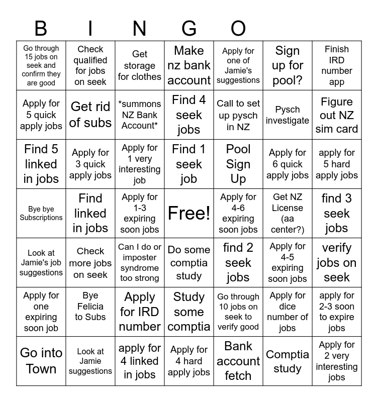 This bingo card has a free space and 97 words: Apply for 1 easy to apply for job, Apply for 1 job that isn't easy to apply to, Look at Jamie's job suggestions, Call to set up pysch in NZ, Find jobs on seek, Find 5 jobs on seek, Find 10 jobs on seek, Find 15 jobs on seek, Money teleport, Apply for 2 quick apply jobs, Apply for 2 hard apply jobs, Go through 5 jobs on seek and confirm they are good, Go through 10 jobs on seek to verify good, Apply for 3 quick apply jobs, Apply for 3 Hard apply jobs, Go through 15 jobs on seek and confirm they are good, Apply for one of Jamie's suggestions, Look at Jamie suggestions, Find a pysch in NZ, Bank account fetch, Apply for 4 quick apply jobs, Apply for 4 hard apply jobs, Apply for one expiring soon job, Apply for two of Jamie's suggestions, Do some comptia study, Apply for 5 quick apply jobs, apply for 5 hard apply jobs, Apply for 6 quick apply jobs, Comptia digital study guide, Comptia handwritten studyguide, Finish IRD number app, Make nz bank account, Comptia study, Apply for IRD number, Find linked in jobs, Find 1 seek job, find 2 seek jobs, Do some nz pysch investigating, find 3 seek jobs, Find 4 seek jobs, apply for 2-3 soon to expire jobs, Find 5 linked in jobs, Apply for 4-5 expiring soon jobs, Apply for 1-3 expiring soon jobs, Apply for 1 very interesting job, Apply for 2 very interesting jobs, Apply for 3 very interesting jobs, Apply for jobs, Get NZ Phone Number, Bank account shenanigans, Get Money from dad, Apply for 4-6 expiring soon jobs, Apply for dice number of jobs, Roll dice for number of job apps, Roll d4 for job apps, roll d6 for job apps, verify jobs on seek, Check qualified for jobs on seek, roll d5 for jobs to apply for, Check more jobs on seek, Can I do or imposter syndrome too strong, Find 10 jobs on linked in, Apply for 1 linked in job, Apply for 2 linked in jobs, Find 15 jobs on linked in, Find linked in jobs, Apply for 3 linked in jobs, apply for 4 linked in jobs, Pysch appointment, time to look for, Bye bye Subscriptions, Get rid of subs, Apply fo jobs, Study some comptia, HSA account investigate, what do with HSA?, Bye Felicia to Subs, Study for comptia+, Subscription nuke, Figure out NZ sim card, Go to AA center to verify documents (downtown), Get NZ License (aa center?), *summons NZ Bank Account*, get rid of subscriptions, AA center visit, NZ doctor (gp), NZ dentist, Pysch investigate, Fetch NZ dentist, Fetch NZ GP, Put away clothes, Get storage for clothes, Sort out luggage, yoga Mat, Pool Sign Up, Sign up for pool?, Go into Town and Sort out unpacking.