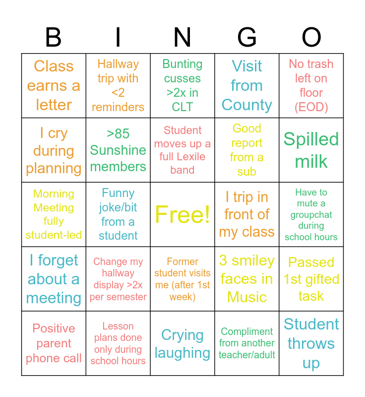 This bingo card has a free space and 24 words: Change my hallway display >2x per semester, Lesson plans done only during school hours, Student moves up a full Lexile band, Positive parent phone call, No trash left on floor (EOD), Class earns a letter, I cry during planning, Hallway trip with <2 reminders, I trip in front of my class, Former student visits me (after 1st week), Good report from a sub, Morning Meeting fully student-led, 3 smiley faces in Music, Passed 1st gifted task, >85 Sunshine members, Compliment from another teacher/adult, Have to mute a groupchat during school hours, Bunting cusses >2x in CLT, Spilled milk, Funny joke/bit from a student, Student throws up, I forget about a meeting, Visit from County and Crying laughing.