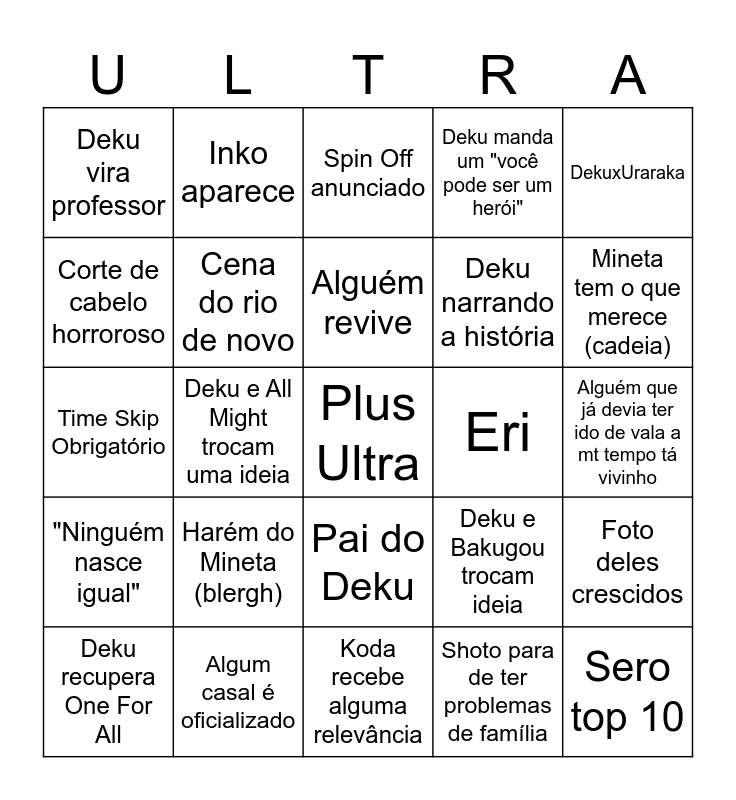 This bingo card has a free space and 24 words: Harém do Mineta (blergh), Algum casal é oficializado, Alguém revive, Deku recupera One For All, DekuxUraraka, Deku vira professor, Corte de cabelo horroroso, Inko aparece, Eri, Pai do Deku, Deku narrando a história, Time Skip Obrigatório, Deku e Bakugou trocam ideia, Foto deles crescidos, Cena do rio de novo, Shoto para de ter problemas de família, Alguém que já devia ter ido de vala a mt tempo tá vivinho, Spin Off anunciado, Mineta tem o que merece (cadeia), Deku e All Might trocam uma ideia, Sero top 10, "Ninguém nasce igual", Deku manda um "você pode ser um herói" and Koda recebe alguma relevância.