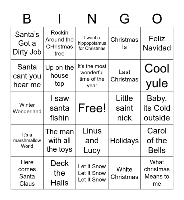 This bingo card has a free space and 54 words: Youre a mean one, It’s a marshmallow World, Oh’ it’s Christmas, I’m gettin nuttin for christmas, Linus and Lucy, Frosty The Snowman, Christmas Is, Underneath the Tree, Santa cant you hear me, Jingle Bell Rock, Santa’s Got a Dirty Job, Christmas in Hollis, Deck the Halls, Here comes Santa Claus, Deck the Hall, Let It Snow Let It Snow Let It Snow, What christmas Means to me, Last Christmas, Wonderful Christmastime, Baby, its Cold outside, Holidays, Mistletoe and holly, Little saint nick, Feliz Navidad, Jingle Bells, Rockin Around the CHristmas tree, All I want for Christmas is you, Someday at Christmas, My favorite things, White Christmas, Mele kalikimaka, Run Rudolph Run, Blue Christmas, Candy Cane Lane, I want a hippopotamus for Christmas, We need a Little Christmas, Winter Wonderland, Carol of the Bells, Grandma Got Run over by a reindeer, Up on the house top, Suzy Snowflake, Christmas of Love, The man with the bag, The Chanukah Song, The man with all the toys, Twelve days of christmas, Santa Bring my baby back, Step into christmas, It’s the most wonderful time of the year, I saw santa fishin, Cool yule, Boogie Woogie Santa Clause, My kinda present and Cuddle up cozy down.