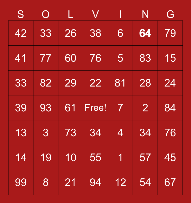 This bingo card has a free space and 48 words: 1, 83, 94, 93, 29, 84, 33, 8, 64, 34, 79, 38, 28, 81, 14, 2, 41, 15, 57, 6, 5, 61, 42, 77, 45, 60, 24, 99, 22, 82, 54, 7, 76, 19, 39, 4, 34, 33, 73, 10, 13, 67, 26, 21, 76, 55, 3 and 12.