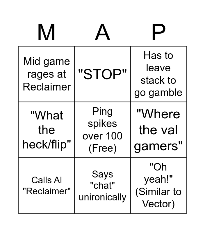 This bingo card has a free space and 8 words: "Where the val gamers", Has to leave stack to go gamble, "STOP", Calls Al "Reclaimer", Mid game rages at Reclaimer, "Oh yeah!" (Similar to Vector), "What the heck/flip" and Says "chat" unironically.