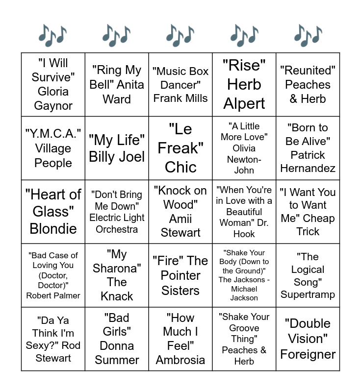 This bingo card has a free space and 24 words: "My Sharona" The Knack, "Bad Girls" Donna Summer, "Le Freak" Chic, "Da Ya Think I'm Sexy?" Rod Stewart, "Reunited" Peaches & Herb, "I Will Survive" Gloria Gaynor, "Y.M.C.A." Village People, "Ring My Bell" Anita Ward, "When You're in Love with a Beautiful Woman" Dr. Hook, "Fire" The Pointer Sisters, "A Little More Love" Olivia Newton-John, "Heart of Glass" Blondie, "Shake Your Body (Down to the Ground)" The Jacksons - Michael Jackson, "The Logical Song" Supertramp, "My Life" Billy Joel, "Shake Your Groove Thing" Peaches & Herb, "I Want You to Want Me" Cheap Trick, "Music Box Dancer" Frank Mills, "Born to Be Alive" Patrick Hernandez, "Don't Bring Me Down" Electric Light Orchestra, "Double Vision" Foreigner, "Bad Case of Loving You (Doctor, Doctor)" Robert Palmer, "Rise" Herb Alpert and "How Much I Feel" Ambrosia.
