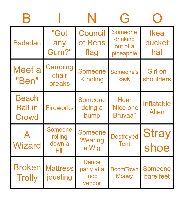 This bingo card has a free space and 24 words: Someone rolling down a Hill, Mattress jousting, Someone K holing, Broken Trolly, Ikea bucket hat, Badadan, Meet a "Ben", "Got any Gum?", Hear "Nice one Bruvaa", Someone Wearing a Wig, Someone's Sick, Beach Ball in Crowd, Destroyed Tent, Stray shoe, Camping chair breaks, BoomTown Money, Inflatable Alien, Council of Bens flag, Girl on shoulders, Fireworks, Someone bare feet, A Wizard, Someone drinking out of a pineapple and Dance party at a food vendor.