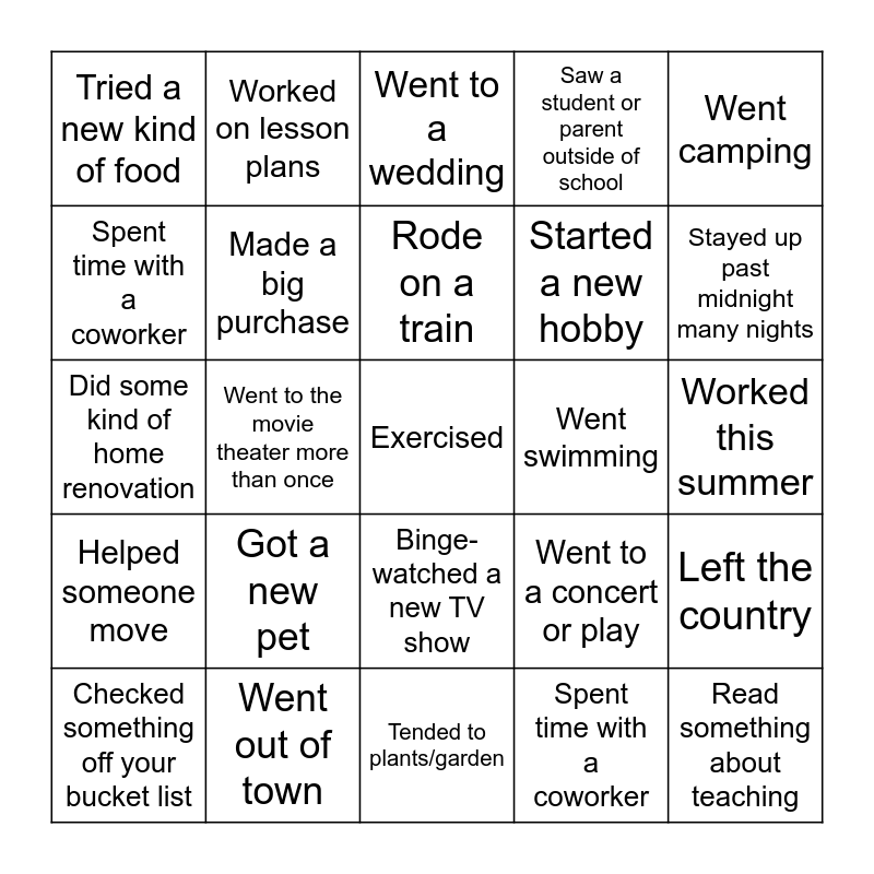 This bingo card has 30 words: Went out of town, Read a good book, Went to the movie theater more than once, Went to a sporting event, Tried a new kind of food, Went to a wedding, Made a big purchase, Binge-watched a new TV show, Went swimming, Tended to plants/garden, Worked this summer, Exercised, Spent time with a coworker, Read something about teaching, Stayed up past midnight many nights, Slept in many mornings, Went to a concert or play, Helped someone move, Got a new pet, Went camping, Did some kind of home renovation, Went to the beach, Worked on lesson plans, Started a new hobby, Spent time with a coworker, Saw a student or parent outside of school, Left the country, Checked something off your bucket list, Rode on a train and Worked in a garden.
