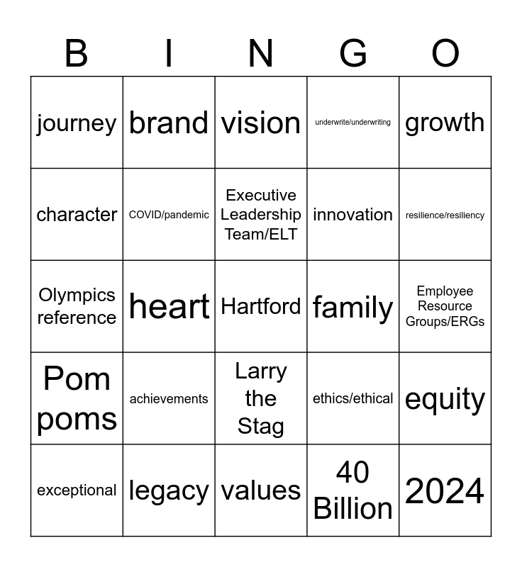 This bingo card has a free space and 53 words: 2013, 2024, 2025, 40 Billion, achievements, award, brand, celebrate/celebration, character, community, COVID/pandemic, emboldening, equity, ethics/ethical, excellence, exceptional, Executive Leadership Team/ELT, family, future, growth, heart, history, innovation, journey, leader/leading/leadership, legacy, new chapter, performance, pride, resilience/resiliency, results, strong, success, talent, technology, trusted, underwrite/underwriting, values, vision, winning, Workplace Communities, Baseball reference, Employee Resource Groups/ERGs, Fireside chat, iConnect/Viva Engage, Larry the Stag, Livestream from another office / Workplace Community, Navigators, Olympics reference, Pom poms, Slido, Stag/Buck and Wallace Stevens.