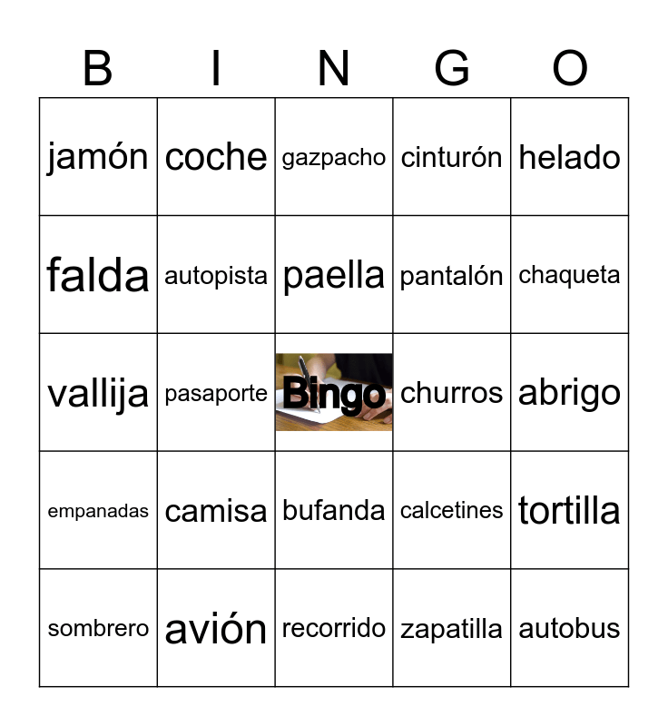 This bingo card has a free space and 24 words: camisa, avión, paella, sombrero, helado, jamón, falda, coche, churros, bufanda, pantalón, vallija, calcetines, tortilla, autopista, zapatilla, abrigo, gazpacho, chaqueta, pasaporte, autobus, empanadas, cinturón and recorrido.