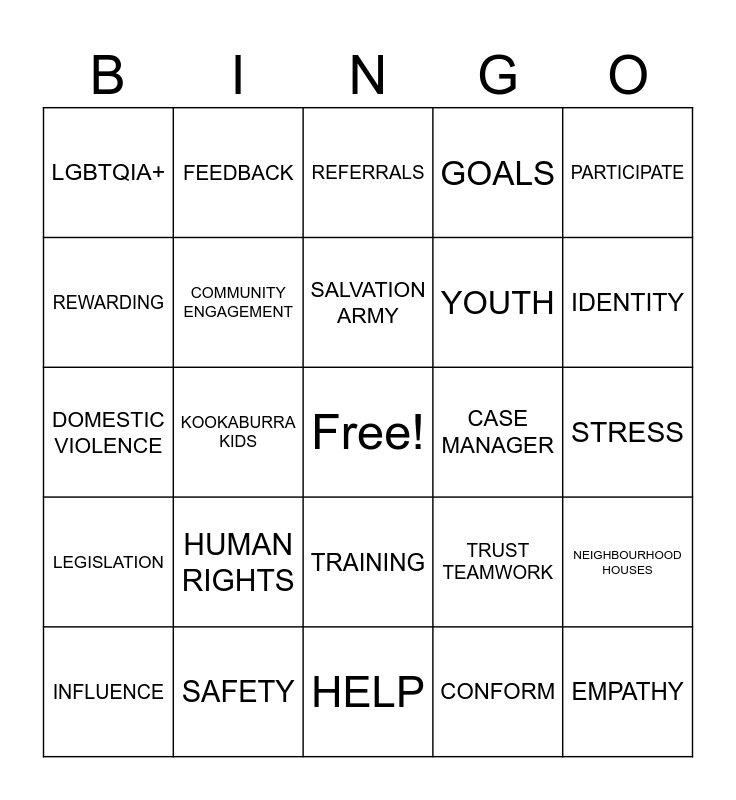 This bingo card has a free space and 118 words: MANUAL HANDLING, DEVELOPMENT, SPIRITUAL, LEARNING, DISCUSSIONS, ORGANISATION, GOALS, OPTIMISTIC, ROUTINE, PROJECTS, COLONY 47, MISSION AUSTRALIA, NDIS, PRAISE, KNOWLEDGE, OBSERVATION, TRAINING, FIRST NATIONS, STRATEGIES, EVALUATE, INFLUENCE, REFERRALS, IMMUNITY, EQUALITY, HISTORY, LEGISLATION, SAFETY, PRIVACY, SECURITY, PLANNING, IDENTITY, SALVATION ARMY, KOOKABURRA KIDS, REFLECTION, RESOURCES, BAPTCARE, SPEAK UP, ADVENTURE, TRANSGENDER, FAMILIES, DISCRIMINATION, DISABILITY, ADAPT, INDIVIDUAL, DRUGS & ALCOHOL, SELF CARE, CONFORM, REWARDING, IMPACT, REFLECTIVE LISTENING, DUTY OF CARE, CASE MANAGER, CO-WORKER, GOVERNMENT SERVICES, MASLOW PYRAMID, EMPLOYMENT, MOSAIC, MEALS ON WHEELS, AGED CARE, RELATIONSHIPS, NEIGHBOURHOOD HOUSES, PROMOTE, ENVIRONMENT, MENTAL HEALTH, GROUPS, ACTIVITIES, WHS, COMMUNITY ENGAGEMENT, DOMESTIC VIOLENCE, LIFELINE, STRESS, CONFLICT, DOCUMENTS, COMMUNICATION, AWARENESS, FEEDBACK, EMPATHY, HUMAN RIGHTS, LGBTQIA+, INCLUSION, REFLECTION, BELIEFS, ETHICS, COLLABORATION, TRUST TEAMWORK, ADOLESCENCE, YOUTH, ELDERLY, REPORTS, VALUES, CASEWORK, RELIEF, SOCIAL, WELFARE, SUPPORT, PARTICIPATE, PUBLIC, CHILDREN, COMMUNITY, ADVOCATE, RESPECT, OUTREACH, ASSISTANCE, VOLUNTEER, RED CROSS, DIVERSITY, CULTURE, PARTNERSHIP, CLIENT, NON-PROFIT, HELP, NETWORKING, VETERAN, ANGLICARE, MENTORING, EMPOWERMENT, HOUSING and EDUCATION.