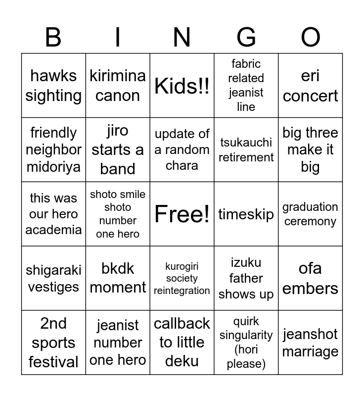This bingo card has a free space and 24 words: bkdk moment, jeanist number one hero, update of a random chara, 2nd sports festival, eri concert, hawks sighting, friendly neighbor midoriya, kirimina canon, timeskip, kurogiri society reintegration, tsukauchi retirement, this was our hero academia, izuku father shows up, ofa embers, jiro starts a band, quirk singularity (hori please), graduation ceremony, Kids!!, big three make it big, shoto smile shoto number one hero, jeanshot marriage, shigaraki vestiges, fabric related jeanist line and callback to little deku.