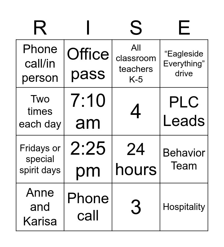 Eagleside RISE Bingo | Policy and Procedures Bingo | Time Bingo | Time Bingo | What time is it?