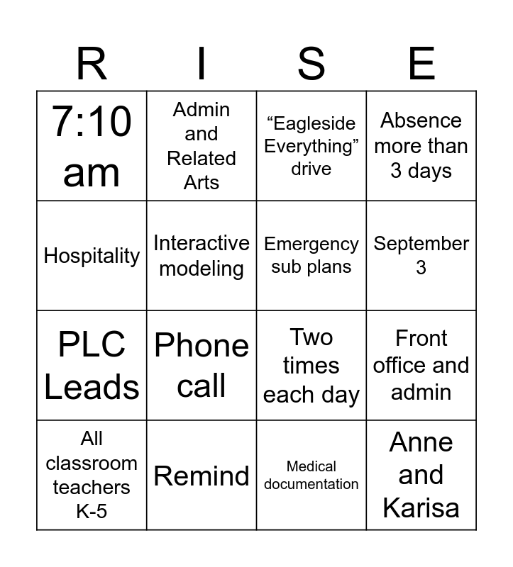 This bingo card has 29 words: 24 hours, 5:00 pm, Front office and admin, Fridays or special spirit days, 7:10 am, “Eagleside Everything” drive, Emergency sub plans, Behavior Team, Remind, Phone call/in person, Medical documentation, All classroom teachers K-5, 4, Behavior referral (paper/electronic), Phone call, 7:05 am, 3, Anne and Karisa, Hospitality, Two times each day, Office pass, August 18, PLC Leads, Interactive modeling, Absence more than 3 days, Admin and Related Arts, 2:25 pm, September 3 and Club request form.
