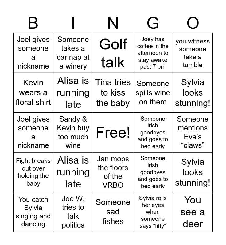 This bingo card has a free space and 64 words: Teacher talk, Joe W. tries to talk politics, Tina tries to kiss the baby, Broken wine glass, Sylvia or Brea spill something, Fight breaks out over holding the baby, Someone takes a car nap at a winery, Golf talk, Someone irish goodbyes and goes to bed early, Someone mentions Eva’s “claws”, Kevin wears a floral shirt, Beth calls someone a whore, Sylvia rolls her eyes when someone says “fifty”, Sylvia looks stunning!, You catch Sylvia singing and dancing, Alisa is running late, Someone sad fishes, Joey has coffee in the afternoon to stay awake past 7 pm, Sylvia talks about Disney, Joel gives someone a nickname, Sandy & Kevin buy too much wine, Jan mops the floors of the VRBO, Someone spills wine on them, Witness someone take a tumble, Joe H. makes friends with the winemaker, Lisa says “oh my goshhh”, Devin and Eli sneak away to play video games/watch anime, You see a Turkey, You see a deer, Ruggero plays Happy Birthday on the sax, Bridget speaks chinese, Car jam sesh on the way to a winery, Teacher talk, Joe W. tries to talk politics, Tina tries to kiss the baby, Someone breaks a wine glass, Sylvia or Brea spill something, Fight breaks out over holding the baby, Someone takes a car nap at a winery, Golf talk, Someone irish goodbyes and goes to bed early, Someone mentions Eva’s “claws”, Kevin wears a floral shirt, Beth calls someone a whore, Someone sad fishes, Sylvia rolls her eyes when someone says “fifty”, Sylvia looks stunning!, You catch Sylvia singing and dancing, Alisa is running late, Jan mops the floors of the VRBO, Joey has coffee in the afternoon to stay awake past 7 pm, Sylvia talks about Disney, Joel gives someone a nickname, Sandy & Kevin buy too much wine, Devin and Eli sneak away to play video games/watch anime, Someone spills wine on them, you witness someone take a tumble, Joe H. makes friends with the winemaker, Lisa says “oh my goshhh”, Car jam sesh on the way to a winery, You see a Turkey, You see a deer, Ruggero plays Happy Birthday on the sax and Bridget speaks chinese.
