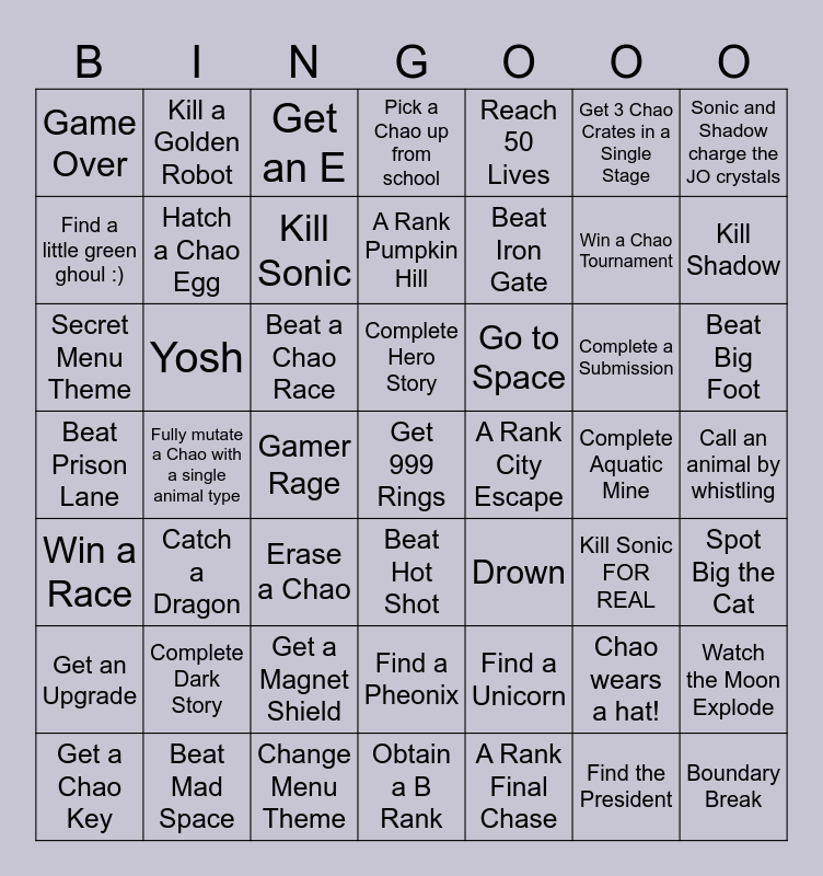 This bingo card has 49 words: Chao wears a hat!, Win a Chao Tournament, A Rank Final Chase, Fully mutate a Chao with a single animal type, Beat a Chao Race, Call an animal by whistling, Kill a Golden Robot, Change Menu Theme, Get 3 Chao Crates in a Single Stage, Beat Hot Shot, Sonic and Shadow charge the JO crystals, Pick a Chao up from school, Complete a Submission, Go to Space, Complete Dark Story, Complete Aquatic Mine, Find a little green ghoul :), Kill Shadow, Watch the Moon Explode, Reach 50 Lives, Beat Iron Gate, Gamer Rage, Game Over, Hatch a Chao Egg, Get a Chao Key, Kill Sonic, Beat Big Foot, Beat Mad Space, Complete Hero Story, Yosh, Boundary Break, A Rank City Escape, Get an Upgrade, Get a Magnet Shield, Beat Prison Lane, Drown, Kill Sonic FOR REAL, Spot Big the Cat, Secret Menu Theme, Erase a Chao, Find a Pheonix, Win a Race, Get 999 Rings, Obtain a B Rank, A Rank Pumpkin Hill, Get an E, Find a Unicorn, Catch a Dragon and Find the President.