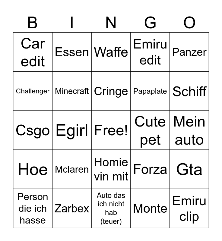 This bingo card has a free space and 24 words: Mclaren, Zarbex, Cringe, Person die ich hasse, Panzer, Car edit, Challenger, Essen, Cute pet, Homie vin mit, Papaplate, Csgo, Forza, Gta, Minecraft, Monte, Mein auto, Waffe, Schiff, Egirl, Emiru clip, Hoe, Emiru edit and Auto das ich nicht hab (teuer).