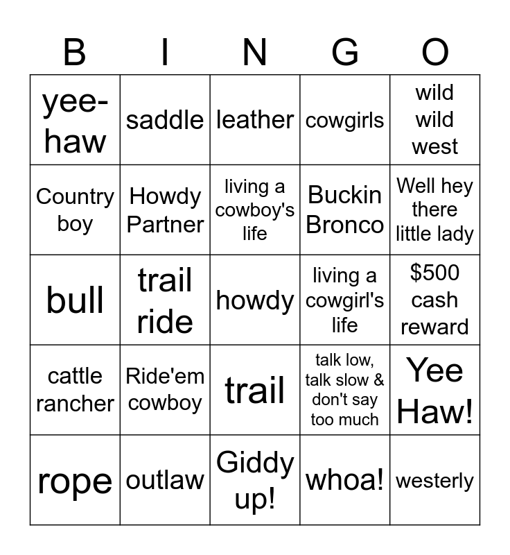 This bingo card has 50 words: cowboy up!, howdy, belt buckle, Giddy up!, Ride'em cowboy, Ride'em cowgirl, saddle, Dukes, Country boy, country girl, Howdy Partner, cowgirls, Yee Haw!, talk low, talk slow & don't say too much, rodeo, western, living a cowboy's life, living a cowgirl's life, Whoa Nellie, wild wild west, trail ride, whoa!, yee-haw, Buckin Bronco, A hog-killin time, westerly, Well hey there little lady, cattle, leather, trail, barn hair don't care, saddle, country roads, wanted dead or alive, outlaw, stirrup, saloon, ride more worry less, chaps, $500 cash reward, canyon, creek, wagon, stallion, rope, bull, raised on an old dirt road, birthday shindig, cattle rancher and bandana.