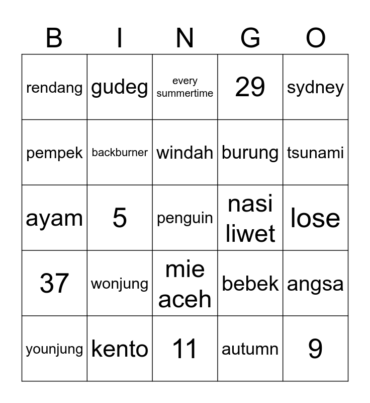 This bingo card has a free space and 24 words: wonjung, kento, windah, younjung, sydney, rendang, pempek, gudeg, nasi liwet, mie aceh, burung, ayam, bebek, angsa, backburner, autumn, lose, every summertime, tsunami, 5, 9, 37, 29 and 11.