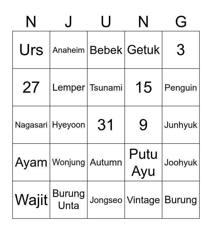This bingo card has a free space and 24 words: Wonjung, Burung Unta, Tsunami, Wajit, 3, Urs, 27, Anaheim, 9, Autumn, 15, Nagasari, Putu Ayu, Joohyuk, Lemper, Vintage, Junhyuk, Bebek, Penguin, Hyeyoon, Burung, Ayam, Getuk and Jongseo.
