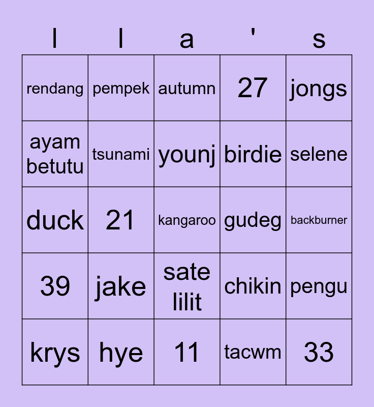 This bingo card has a free space and 24 words: jake, hye, younj, krys, jongs, rendang, ayam betutu, pempek, gudeg, sate lilit, birdie, duck, chikin, pengu, tsunami, tacwm, backburner, autumn, selene, 21, 33, 39, 27 and 11.